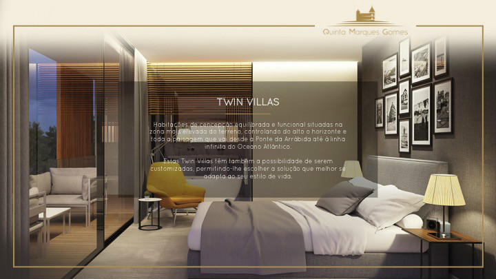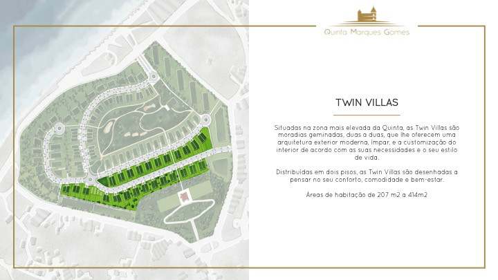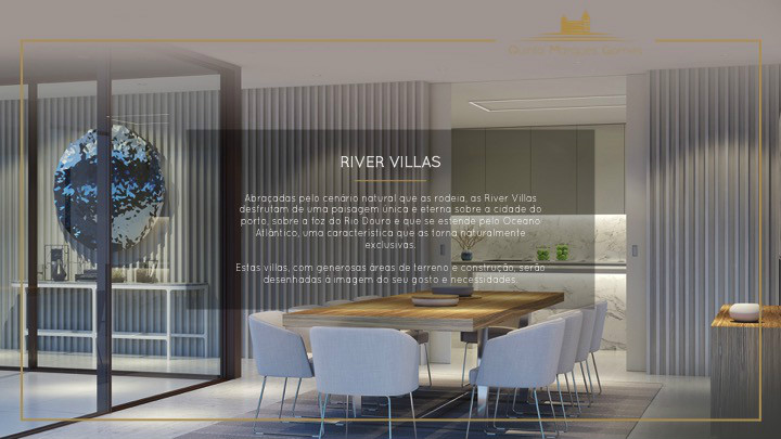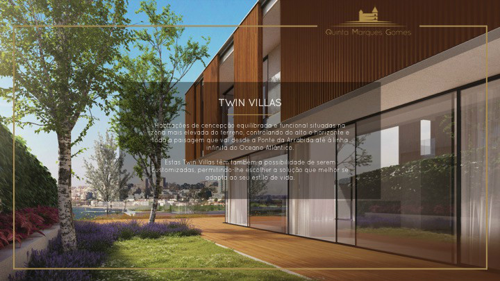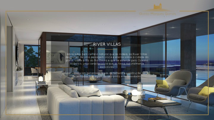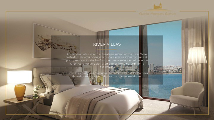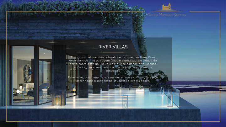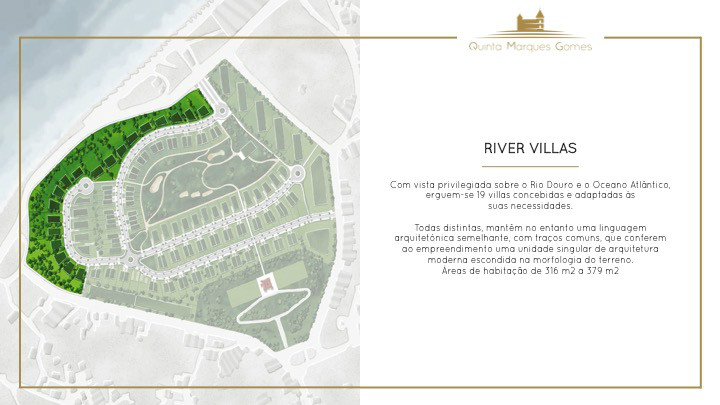O masterplan da Quinta Marques Gomes foi criteriosamente desenvolvido para se tirar o máximo proveito da morfologia natural do terreno. Um perfeito anfiteatro que se desenvolve desde o alto do palacete até à margem do Rio Douro, proporcionando aos seus moradores vistas sem igual.